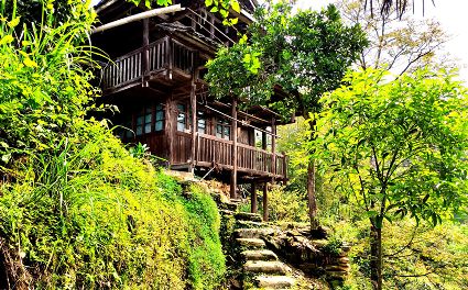 一眼的山,一眼的綠,一眼的云霧,一眼的煙雨,從吊腳樓木格花窗亮麗妖嬈走出來(lái)。經(jīng)過(guò)吊腳樓的旅人,不經(jīng)意就會(huì)站成一棵長(zhǎng)腳的樹(shù)。