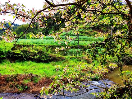 今年天氣反常,長(zhǎng)期陰雨卻氣溫不低,桐子花沒(méi)有等到倒春寒來(lái)襲就迫不及待綻放了。那綠葉襯托下的桐子花,白里透紅,一簇簇、一片片,錯(cuò)落有致地散落在坡谷地頭溪畔,在暮春的細(xì)雨中裝點(diǎn)著鄉(xiāng)村的寧?kù)o。