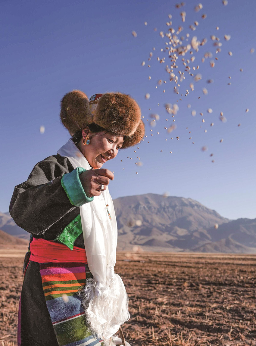 近日,西藏農(nóng)民舉行一年一度春耕大典。村民沿襲著傳承千年的春耕民俗,身著節(jié)日盛裝,手捧“切瑪”(五谷豐登斗),唱起祈愿歌,互敬青稞酒。當(dāng)鐵犁翻開土地,婦女將手中的種子撒下,祈求新的一年豐收。