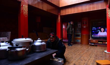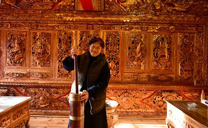 道孚民居的精華在其內(nèi)部,木材是其唯一的內(nèi)部裝飾材料,而裝飾,是一項繁瑣得曠日持久的藝術(shù)勞作,往往建房只需一兩個月,內(nèi)部裝飾則要幾年甚至幾十年。民間建筑藝術(shù)家們沉醉在細致入微的勞作里,讓每一個圖案都盈溢一份心底的吉祥,讓每一筆描摹都傳遞一份動人的傳說。房間四壁、房門和梁柱上一般都繪滿了精致典型的藏式壁畫,窗上分別雕刻著龍、鳳、仙鶴、麒麟等吉祥圖案。每間屋的大門上都鑲嵌醒目的兩個獅頭大銅環(huán),凸顯了與之相融的漢文化的特點。置身其間,色彩斑斕中,身邊盡是龍飛鳳舞,鶴翔麟躍。繽紛中細端詳,真是藏民族藝術(shù)的天堂!