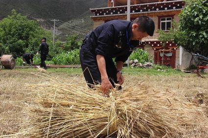 “不能讓鄧珠家成熟了的小麥爛在地里。”近期,巴塘縣陰雨天氣給當(dāng)?shù)卮迕袷崭钚←湈聿槐?。該縣夏邛派出所民警自發(fā)來到夏邛鎮(zhèn)河西村特困戶鄧珠家田地,以最快的速度幫助收割、捆綁、脫粒等一系列搶收工作。據(jù)悉,夏邛派出所民警在開展“一標(biāo)三實”工作時,將當(dāng)?shù)乩щy戶、殘疾戶、五保戶等缺少勞動力的家庭銘記在心,每逢播種秋收都會進行幫助。