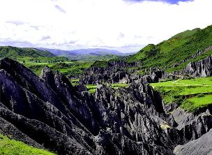 墨石公園,是中國唯一高原石林景觀,被譽(yù)為“中國最美景觀大道第八美 ”。受第四紀(jì)新構(gòu)造運動影響,隨著青藏高原的隆起,鮮水河斷裂帶中的巖石受到擠壓、剪切、破碎、糜化,形成糜棱巖石林。石林含丐鹽,受空氣濕度影響,干燥季節(jié)呈淺灰色、淺藍(lán)色,濕潤季節(jié)呈滄黑色,因此又稱之為變色石林。