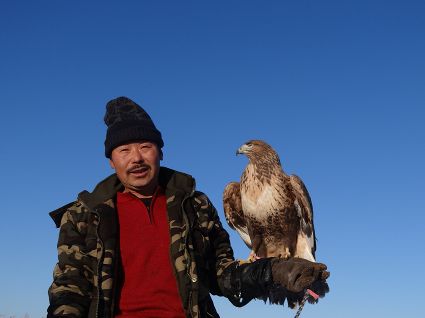 “小一點(diǎn)的鷹好訓(xùn),訓(xùn)老一點(diǎn)的叫熬鷹。 開(kāi)始熬鷹前,一次性喂飽鷹,七天七夜不吃不喝不睡覺(jué),待七天時(shí)到,放鷹于空,手中拿肉,用我們倆特殊的交流方式指揮它,這時(shí)它會(huì)落我的手臂上。但是,這一只始終沒(méi)服過(guò)我。訓(xùn)出來(lái)一只大約半月左右。”訓(xùn)鷹人說(shuō)。