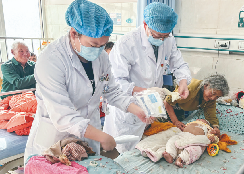 圖為醫(yī)護(hù)人員正在為患兒換藥。