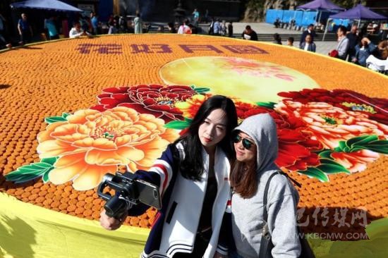 民眾與“花好月圓”大月餅合影。 王中舉 攝