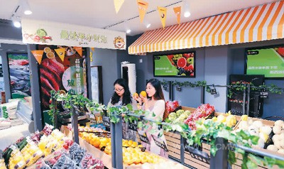 蘇寧小店主打生鮮、果蔬、熱鮮食等品類,致力打造成社區(qū)的“共享冰箱”。圖為蘇寧小店內(nèi)景。(蘇寧供圖)
