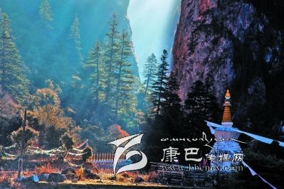 進(jìn)得溝來(lái),卻又是另一番景致。溪水在窄細(xì)的深谷中忽隱忽現(xiàn),水聲叮咚,時(shí)而從碎石卵灘下潛淌,時(shí)而冒出雪花樣的身影,不張揚(yáng),含靦腆,與兩邊千仞峭崖的兇猛樣恰成強(qiáng)烈對(duì)比。此時(shí)容不得你不抬頭望山,望天了。極盡險(xiǎn)峻的峭壁奇峰,危巖巨石,陰面如潑了墨暈,陽(yáng)面露了慘白,硬硬地把個(gè)溝谷擠成了“一線天”,駭?shù)谜锪锏奶焐弦粌蓤F(tuán)亂云也不敢停歇片刻,欲飄走,卻又被錯(cuò)落參差的山峰撕得七零八落。更有那墨黑如黛的松柏齊齊地排隊(duì)豎立在危崖峭壁間,或一兩階,或三四階,如挎刀武士護(hù)著峭崖,又如黑大漢長(zhǎng)的亂糟糟的絡(luò)腮胡,徒增添了猙獰之貌。傳說(shuō)皮察溝內(nèi)有座黑教的神山——呷拉神山,每到“朝山會(huì)”,農(nóng)牧民前去神山朝拜。然而,呷拉山頂不知何時(shí)棲居了一只碩大的“夏甲曲絨”(意為一種兇惡的鳥(niǎo)),不時(shí)將村里百姓的牛、羊叼到山頂吞食。藏王格薩爾得知此事,決心要除掉“夏甲曲絨”。 “夏甲曲絨”得知格薩爾王大軍前來(lái)征服它,十分懼怕,數(shù)日藏于洞中不敢出來(lái)。格薩爾王隱身于巖石背后,讓王妃珠牡設(shè)法引“夏甲曲絨”出洞。“夏甲曲絨”形體碩大,棲息的洞無(wú)法掩其全身,頭部露在外面,時(shí)時(shí)觀察動(dòng)靜。珠牡到接近洞口的地方,滔滔不絕地贊譽(yù)“夏甲曲絨”長(zhǎng)得美麗,它禁不住贊美,漸漸地伸長(zhǎng)頭頸,最后驕傲地露出潔白的全身,并高昂著頭。格薩爾王趁機(jī)迅速?gòu)埞罴患渲?ldquo;夏甲曲絨”的頸部,血流滿山,以后這座山便變成了紅山。當(dāng)“夏甲曲絨”負(fù)痛逃至皮察溝“一線天”時(shí)已精疲力竭,便停留在山崖中。格薩爾王隨即趕到,藏于灌叢,背靠巨石用腳一蹬(至今天一巨石呈凹形,似有人蹬過(guò)),再次射中“夏甲曲絨”。“夏甲曲絨”負(fù)痛逃去,停在覺(jué)然村一巨石上做垂死掙扎時(shí),它的爪爪在巨石一抓了無(wú)數(shù)道溝痕,后人把這個(gè)巨大石稱為“鬼抓石”……我無(wú)意去尋找“紅山”、“腳蹬石”、“鬼爪石”等,也沒(méi)想深究格薩爾除妖是否用過(guò)“美人誘惑計(jì)”,但卻在溝谷里發(fā)現(xiàn)一個(gè)與眾不同的現(xiàn)象:在一處窄小的谷地路傍,長(zhǎng)滿了雜枝黑蔓的灌叢,灌叢上彩幡密布,鉆進(jìn)灌叢,里邊竟然塑了一尊格薩爾王的神象,神象不高大,卻威儀,的確像是藏在崖壁下灌叢中……很容易讓人想到故事中的情節(jié)。