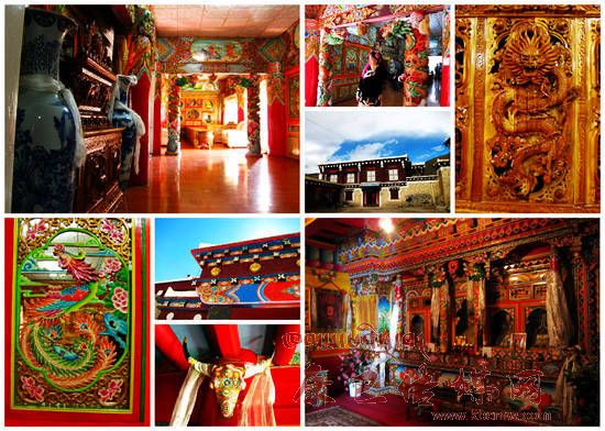 這些民居外表主要由棕白兩色構成,白色的屋頂,白色的主墻,木結構處多用棕色顏料染涂,其間配以紅、藍圖案,在藍天、白云、青山、綠水的映襯下,幻化成妙不可言的積木圖案。白色的房頂與寬敞的院壩里,身著艷麗藏裝的少女或身著絳紅色衣衫的喇嘛飄拂其間,給人一種“世外桃源”的感覺。