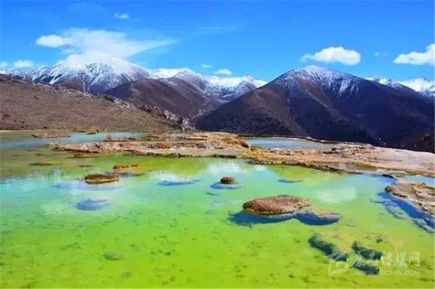 泉華灘海拔約4000米,屬于高山河谷草甸地貌。東南面就是貢嘎山,這里是觀看“蜀山之王”的絕佳位置。它因一種含有大量化學物質(zhì)的泉水在地表產(chǎn)生化學沉淀而成,從另一個山頭傾斜下來大片的白色鈣化土,延伸到谷底后便變化出四層五彩的鈣化池。每個階地上有十幾個大小不同、形態(tài)各異的五色彩池,水深40-70厘米,彩池里水草相依,石花點點,疑為瑤池降臨人間!