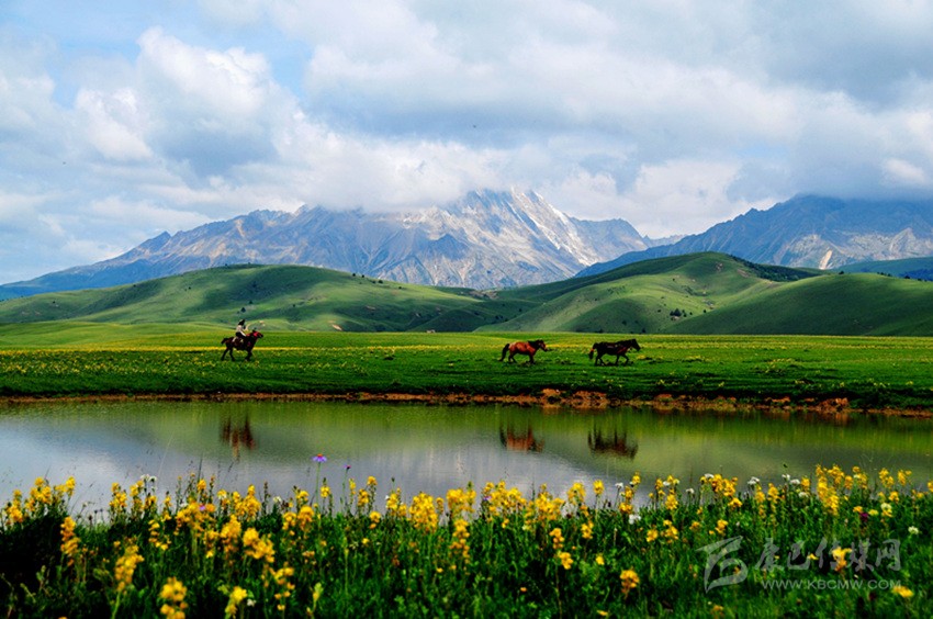 夕陽(yáng)照耀湖水,閃著金銀光;綠樹(shù)撐著青天,到處莽蒼蒼;牧民家的房子,五彩斑斕樣;藍(lán)色天空之上,白云在飄蕩;青石河岸之畔,繽紛百花香……這里是寫(xiě)生的圣殿,這里有攝影的天堂,這里是讓人魂?duì)繅?mèng)縈的夢(mèng)里仙鄉(xiāng)。