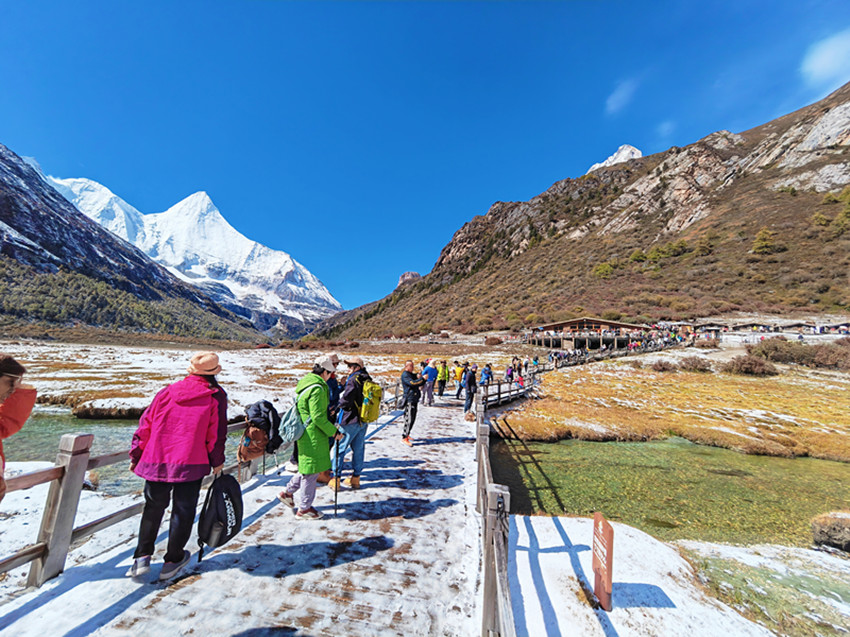在三怙主神山、牛奶海、五色海、珍珠海、沖古寺、洛絨牧場(chǎng)等景點(diǎn)處,游客們絡(luò)繹不絕,忙著感受和記錄亞丁的初雪。