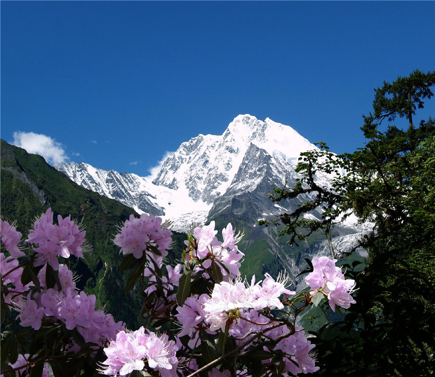 從海螺溝翻越雅家埂到康定的道路兩旁有很多品種的杜鵑花,埡口海拔1000米下生長(zhǎng)的杜鵑花樹(shù)高大,以緋紅色、粉紅色、紫色為主。海拔越高,花樹(shù)越矮,從山頂?shù)缴窖恢变佒氖前咨幕ǘ?,像是交織在山野的白花地毯?/p>