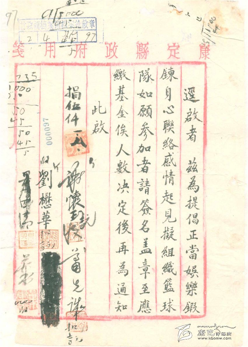 這是一張用解放前的康定縣政府便箋寫的“啟事”,內(nèi)容是倡議成立一支籃球隊(duì)。在上面簽字的有十多個(gè)人,這十多人一定是籃球運(yùn)動(dòng)的愛好者。至于這支籃球隊(duì)后來(lái)是不是成立等等都不見下文。而且,從這張“啟事”上看不到這件事發(fā)生在哪一年,只有一位名叫李培清的人寫下了收到捐款5700元、“三月三十日”的日期。最有意思的就是,在這張“啟事”上記下了的這句話:縣長(zhǎng)捐購(gòu)籃球款伍仟元。這句話起碼包涵了以下的意思,一,康定城里已經(jīng)興起了籃球運(yùn)動(dòng);二,成立籃球隊(duì)沒有專門的經(jīng)費(fèi),幸好人們有很高的積極性,連縣長(zhǎng)也主動(dòng)捐款,那些簽名后面隱約可見的數(shù)字也可能是捐款的數(shù)字。
