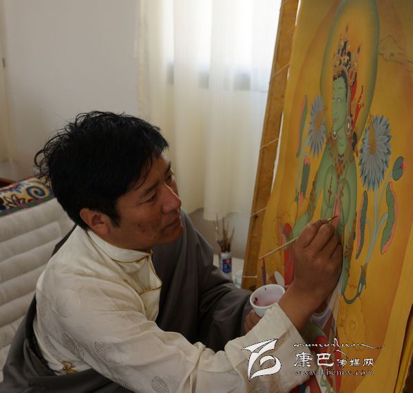 “如此工藝精細(xì)、筆法工整的繪制過(guò)程,必然注定價(jià)值的與眾不同。”記者話音未落,他便迫不及待地加以了例證:“比如,要繪制一幅長(zhǎng)1.25米、寬1米的‘多派唐卡’,需要有近百個(gè)佛像,最小的佛像頭部只有指甲蓋大小,筆觸要求非常細(xì)膩,哪怕每天都堅(jiān)持畫十幾個(gè)小時(shí),至少也要一年多時(shí)間來(lái)才能完成。由于題材從宗教轉(zhuǎn)向世俗、審美從傳統(tǒng)走向現(xiàn)代、技法從圖像制作走向藝術(shù)創(chuàng)造,唐卡作為‘藏密文化’的概念正逐漸被世人所知,并成為唐卡藝術(shù)品市場(chǎng)上的寵兒。2012年3月18日,我和一級(jí)唐卡畫師丁嘎創(chuàng)作的《五度母像》長(zhǎng)幅唐卡以168萬(wàn)元的高價(jià)被收藏者購(gòu)買,創(chuàng)下了‘多派唐卡’最高售價(jià)紀(jì)錄,‘多派唐卡’也因此成了公眾與輿論關(guān)注的熱點(diǎn)和焦點(diǎn)。”