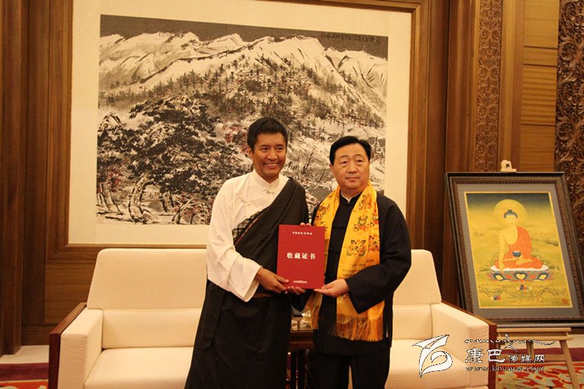 產(chǎn)業(yè)化發(fā)展的探索之路,不僅圓了年敘·多吉頓珠的“文化產(chǎn)業(yè)夢(mèng)”,而且也讓他實(shí)現(xiàn)了一次華麗轉(zhuǎn)身,成為一名有擔(dān)當(dāng)?shù)钠髽I(yè)家。今年9月5日至15日,由中華文化發(fā)展促進(jìn)會(huì)、西藏自治區(qū)文化廳、西藏自治區(qū)文學(xué)藝術(shù)界聯(lián)合會(huì)、西藏自治區(qū)文化產(chǎn)業(yè)協(xié)會(huì)主辦,西藏崗地文化產(chǎn)業(yè)集團(tuán)、西藏拉姆拉綽唐卡畫院承辦的“西藏唐卡藝術(shù)——多吉頓珠、丁噶唐卡作品展“在北京中國(guó)國(guó)家博物館舉行。他和丁嘎先生現(xiàn)場(chǎng)向國(guó)家博物館捐贈(zèng)了《釋迦牟尼》、《五方度母》、《綠度母》和《觀音》四幅精品,這是國(guó)家博物館首次收藏多派唐卡和嘎瑪嘎智畫派唐卡,填補(bǔ)了國(guó)家博物館館藏嘎瑪嘎止畫派和多派唐卡的空白。國(guó)家博物館館長(zhǎng)呂章申先生熱情為兩位大師頒發(fā)了收藏證書并激動(dòng)地說(shuō):“多吉頓珠先生和丁嘎先生捐贈(zèng)的精品力作,豐富了中國(guó)國(guó)家博物館的館藏,更好地弘揚(yáng)了西藏文化藝術(shù)。國(guó)家博物館有責(zé)任把最好的藝術(shù)品收藏起來(lái),留存于后世。”
