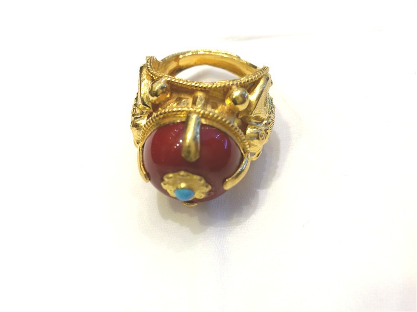 蜜蠟是藏家裝飾中的上成品,藏民族對蜜蠟的喜愛是非常誠懇的,表達著他們對大自然的無限崇敬之情與大自然饋贈的感謝之情。在他們看來,蜜蠟除了能夠作裝飾品佩戴、收藏之外,最引人注目的就是靈性修行之功效,設計師在此款戒指的設計上,緊扣藏民對蜜蠟的喜愛,并將漢式花邊與蜜蠟結(jié)合,是對藏漢文化交流較好的體現(xiàn)。
