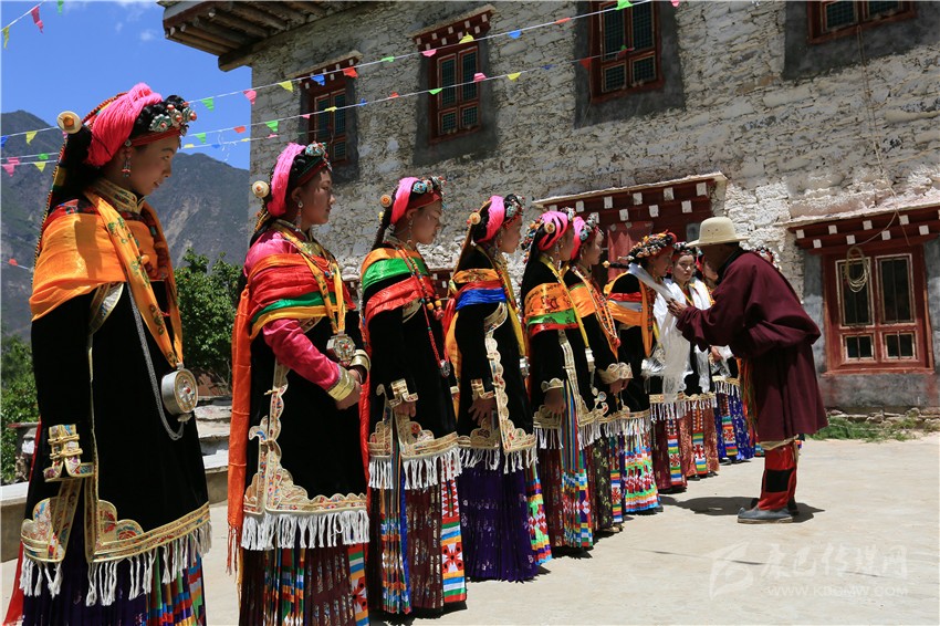 丹巴嘉絨藏族女子的成年禮一般以自然村落為單位,舉行的時間需請喇嘛或貢巴擇吉日,或在農(nóng)事有閑的時候。參加成年禮的成年女性人數(shù)不定,可集體、也可以單獨(dú)舉行,其原則是女子必須歲足17歲;若已足17歲,如遇農(nóng)事繁忙,也可適當(dāng)延期。