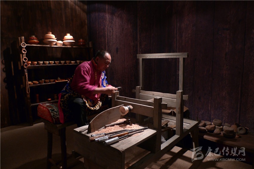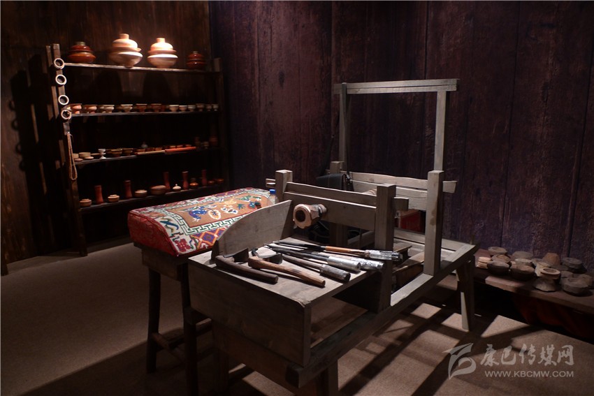一處古色古香的展柜上,各種藏式木制茶具、碗散發(fā)著古老質(zhì)樸的氣息,天然的花紋自然流暢,色澤婉轉(zhuǎn)溫厚。距離展柜較近的地方,兩架可手工操作的藏式木制機(jī)器有規(guī)律地運(yùn)轉(zhuǎn)著,來(lái)自得榮的格絨次仁父子正在機(jī)器上演示藏式木碗的制作過(guò)程。
