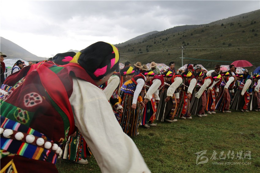 10月2日,在木雅鍋莊悠揚的旋律和輕盈的舞步中,歷時兩天的“2017康定情歌國際音樂節(jié)”盛大開幕,作為“五大民俗展演”中的特色民俗歌舞表演部分,木雅鍋莊吸引了眾多游客的關(guān)注。木雅鍋莊來源于木雅人的日常生產(chǎn)和生活,是當?shù)剞r(nóng)耕文化習俗的重要表現(xiàn),表演服飾多以棕紅色外套,紅、白色襯衫為主,表演者多佩戴紅頭繩、珊瑚、金銀等裝飾物。舞蹈分男女兩組,列隊圍桌成圓形,皆彎腰垂首隨領唱歌聲而舞。男組舞姿氣勢豪放,女組舞姿委婉優(yōu)雅。唱腔宛轉(zhuǎn)悠揚,吸引了在場觀眾冒雨駐足觀看,有的甚至情不自禁隨著舞群踏起了舞步,融入到康巴文化的神秘魅力當中。
