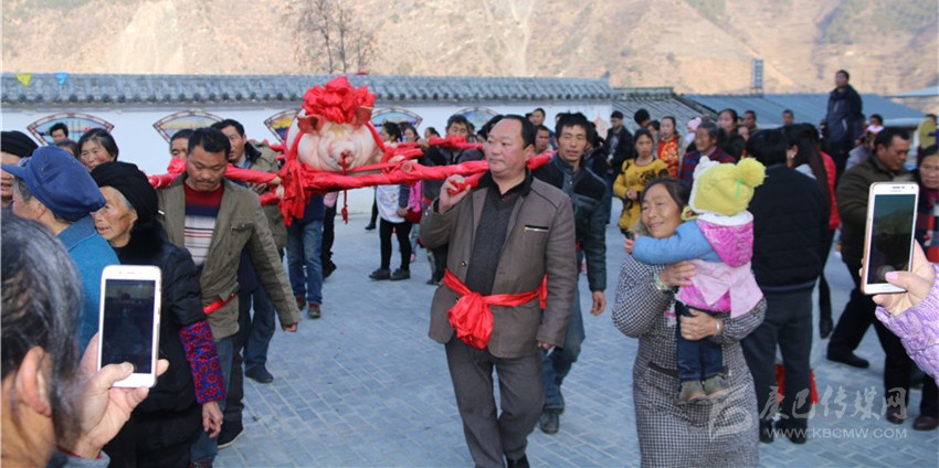 5個(gè)村民將年豬抬到秤上。360斤。村民為年豬準(zhǔn)備大紅花。準(zhǔn)備紙錢、香蠟。9點(diǎn)整,殺豬匠開始了他的工作,在眾人齊心協(xié)力下,光溜溜的年豬被打整干凈?!氨S游覀兇鍋砟觑L(fēng)調(diào)雨順、五谷豐登,村民平安健康?!贝逯欣险呔催^天地后,8個(gè)身強(qiáng)力壯的村民站在年豬旁,豎著拇指齊聲說,今年家家戶戶還要養(yǎng)大肥豬。抬著年豬,村里的中老年人簇?fù)碇?,走在最前面,唱著悅耳的民謠,大意是歌唱幸福生活的,迎著2018年的第一縷陽光,村民們喜氣洋洋。到村里來的游客蜂擁拍照。