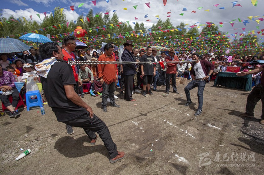 除以上活動(dòng),滾桶接力、俯撐馬鞍吃葡萄、穿藏裝揉糌粑、套牛角等趣味比賽無(wú)不展示民族體育的獨(dú)特風(fēng)格。“這種拔河還是第一次見(jiàn),很有意思?!逼渲校案裢獭北荣悾ò褞ё犹自诓弊由习魏樱┥畹糜^眾喜愛(ài)。