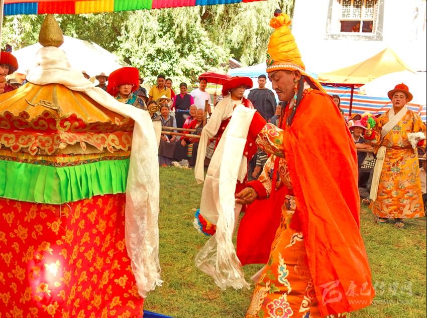 初次看到巴塘藏戲是康巴衛(wèi)視藏歷春晚,原以為是寺廟舞蹈,在唱聲杳杳里類似川劇的喉腔讓我覺得新奇,于是找些資料看看了巴塘藏戲介紹。藏戲的開山鼻祖唐東杰布。藏民歷來(lái)把他看作是創(chuàng)造藏戲的戲神和修建橋梁的鐵木工匠的“祖師”,是藏族人民心目中智慧、力量的化身。他將佛教經(jīng)典中的傳記同民間傳說(shuō)、神話故事等內(nèi)容融在一起,創(chuàng)作出一種具有人物性格和舞蹈、唱腔相結(jié)合的表演藝術(shù),使過(guò)去單一的跳神舞逐漸地戲劇化,表現(xiàn)手段也不斷加強(qiáng),并從宗教儀式中分離出來(lái),形成了藏劇藝術(shù)的雛形。