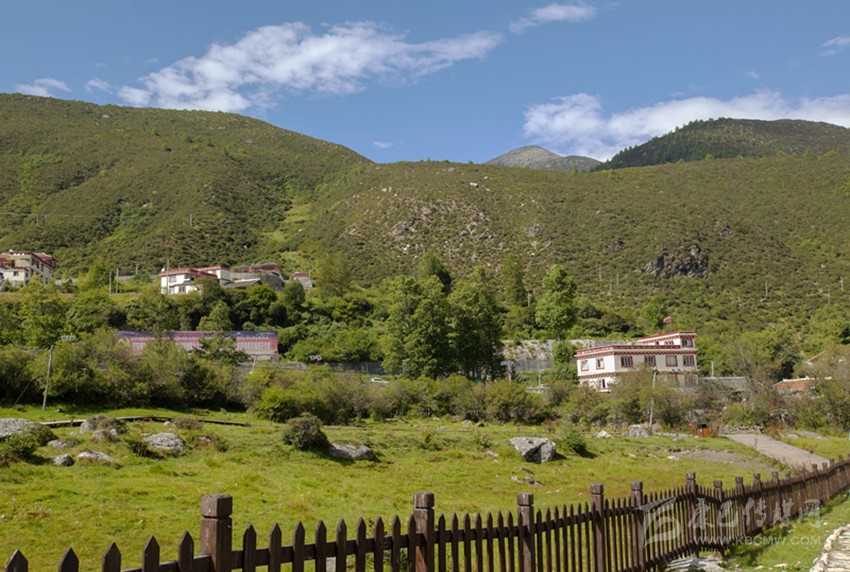 折多塘村房舍現(xiàn)多數(shù)沿公路兩側(cè)筑建。其實沒通公路前,山間馱道應(yīng)是村后呈椅狀的一片草坡上。草坡邊自古就有的一方露天溫泉池塘水霧彌漫,熱氣蒸騰,正應(yīng)了前人所記“山凹有熱泉沸起”、“憇啞池塘,帳宿于折多”;且在舊時馭馬馱牛的行旅中宿棧,這寬大的草坪方適合繃搭帳蓬和放牧牲畜,露天溫泉又可洗濯行旅之勞頓。