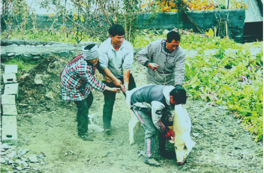 殺年豬是三埡人過(guò)年的重頭戲。清晨,家家戶(hù)戶(hù)的炊煙升起,此起彼伏的殺豬聲響徹村落。各家的院壩里,有的燒豬毛、開(kāi)膛、剁肉,有的灌香腸、腌臘肉,大家分工明確,有序忙碌,不一會(huì)兒,小孩兒們就能吃到在火塘里烤熟的香腸、豬肝和豬腦花。