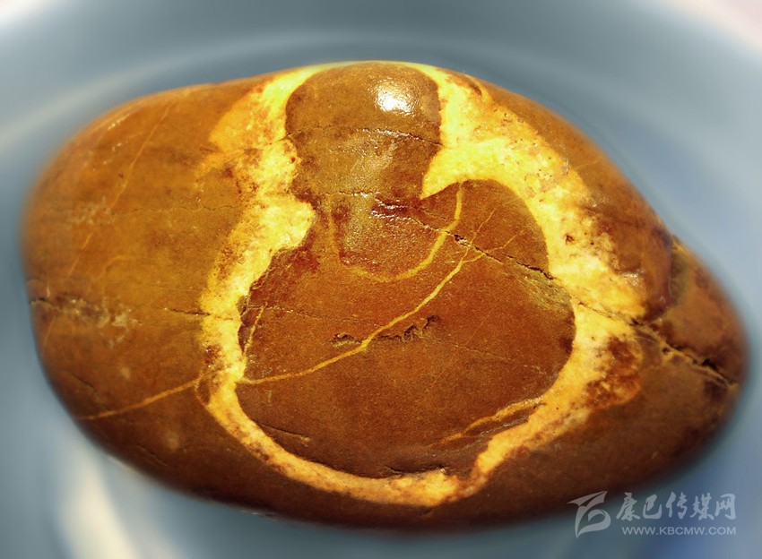 作為一個無組織的業(yè)余獨(dú)行淘石者,經(jīng)過數(shù)年的摸、淘、琢磨,我悟出:發(fā)掘趣石最重要的是要獨(dú)具慧眼慧心,會讀石紋。是否讀懂石紋,決定著一塊石頭是頑石還是奇石的命運(yùn)。這是一件很難的事,不僅要運(yùn)用你獨(dú)特的審美視角,還得發(fā)揮你豐富的想象。有時,為了讀懂一些石紋,我會抱著這塊石頭如考古學(xué)家般仔細(xì)琢磨,從正面、側(cè)面,再到背面,又從左邊旋到右邊,或者上下顛倒來打量……一番冥思苦想,會意會神,直到靈感涌起、慧心頓悟,尤如洞天石扉訇然中開,眼前的頑石拙巖,頃刻便化為藝術(shù)珍寶,令我欣喜若狂。正如悉達(dá)多說:“這塊石頭是石頭,它也是動物,也是神,也是佛,我敬重它和熱愛它,并非因為它有朝一日會變成這個或那個,而是因為它早就是這一切,一直是這一切?!背錆M靈性的石頭在你和美妙的自然間搭起了一座通靈的橋梁。淘得趣石,還需緣分。就像人與人的相遇講究緣分,遇到心儀的石頭也講究緣分天助。有年春節(jié),我與父親去河邊轉(zhuǎn)游,面對涪江寬闊的石灘,我的淘石癮又犯了。但出門前答應(yīng)過父親,這次只逛不撿石頭。我知道老爸心疼我一個女子大過年的撿石頭。河邊冷,且石頭扛起來很重,手與衣服都會弄得很臟。我邊陪父親漫走閑聊,眼睛卻止不住往河灘逡巡,仍希望無意中淘到中意的石頭。走著走著,我發(fā)現(xiàn)有一群鳥歡唱著從遠(yuǎn)處一個石堆飛起,冥冥中感覺那里有寶貝,遂向老爸懇求,過去看一下就回來。來到那個石堆中心,幾乎不費(fèi)什么功夫,就看到一塊橢圓形石頭上有著一個自帶金色佛光圈的如來佛半身像。我怔住了,有點(diǎn)不敢相信如此幸運(yùn),蹲在那里久久打量。老爸隨后趕過來,看到佛像石,連連贊嘆了好幾句“太神奇了”。然后,他毫不猶豫地就幫我把石頭搬起來就走?;氐郊抑?,如獲至寶的我,趕緊清洗石頭,在清水的滋潤下,佛像的輪廓更加清晰。頸上的佛珠、袈裟線也分明,細(xì)看令人叫絕的這竟是一尊三面佛:正面、左側(cè)向、右側(cè)向均是佛。而在此石背面,也清晰出現(xiàn)了一個草書的“吉”字,真令人喜出望外。吉佛石,就這樣神奇地走進(jìn)了我的生活,讓我相信一切緣分都是可遇不可求的。