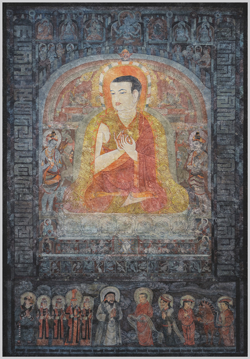 從“三怙主”往兩邊發(fā)展,分別是早期“薩迦五祖”中的前“四祖”:初祖貢噶寧布(1092--1158年);二祖索南孜摩(1142--1182年),三祖扎巴堅贊(1147--1216年),四祖貢噶堅贊(1180--1251年),即“薩迦班智達”。而薩迦第五祖就是畫面正中的八思巴(1235--1280年)。根據(jù)藏文史料,薩迦五祖中的前三祖稱為“白衣三祖”,因為他們都沒有正式出家受比丘戒,而是身著俗衣以居士身份自居;后二祖稱為“紅衣二祖”,因為他倆正式出家為僧,受過比丘戒,身著紅色袈裟。1253年夏天,忽必烈的軍隊到達六盤山一帶,請八思巴到軍營一敘,雖然有的史書記載之前八思巴就與忽必烈見過面,但這次是八思巴第一次以薩迦教主身份正式會見忽必烈。畫面的下方表現(xiàn)的就是“六盤山相會”的歷史場景。畫面右邊是八思巴一行列隊迎接的場面。中間著紅色吐蕃服裝者即是八思巴,他手捧哈達、神情莊嚴的給忽必烈獻上哈達,紅色吐蕃衣服暗示他當(dāng)時還未受比丘戒的“紅衣”身份;在他身后哈達搭肩、雙手合十者為其弟恰那多吉,藏青色衣服暗示他的俗人身份;隊列后面是兩位服侍教主的僧侶,他們頭戴吐蕃氈帽、牽馬負笈等候在一旁。左邊是蒙古王族的儀仗隊列,為首便是身著白色裘衣的忽必烈。其后是三個侍女簇擁著的察必王妃,第一位侍女扶著代表皇族的華蓋,而淡青色華蓋說明:忽必烈當(dāng)時尚未繼承蒙古大汗位。察必王妃和侍女皆穿著紅色的蒙古弘吉剌部落服裝,所不同的是王妃服飾比侍女服飾更顯尊貴和優(yōu)雅;隊伍的最后是一位穿著青衣、佩戴短刀的蒙古侍衛(wèi)。整個蒙古王族隊列面對將來的帝師八思巴,大家都謙遜、虔誠、靜穆地雙手合十致意。忽必烈、察必王妃以及八思巴的形象是根據(jù)古代繪畫作品和文字描述而創(chuàng)作的,服飾、用具、民風(fēng)民俗也都經(jīng)過仔細的研究考證。畫面兩邊是用“八思巴文”的字母組成的紀念柱,彰顯八思巴創(chuàng)立“蒙古新字”的功勛。受忽必烈指派,八思巴借鑒藏文拼讀方式創(chuàng)制出由41個字母構(gòu)成的一種新文字,其語音拼讀均按蒙語,又稱“八思巴蒙文”。八思巴向忽必烈呈獻蒙古新字后,忽必烈極為高興,并於1268年下詔,凡是詔書及各地方公文等均必須使用蒙古新字,在全國范圍內(nèi)推行這種新文字。