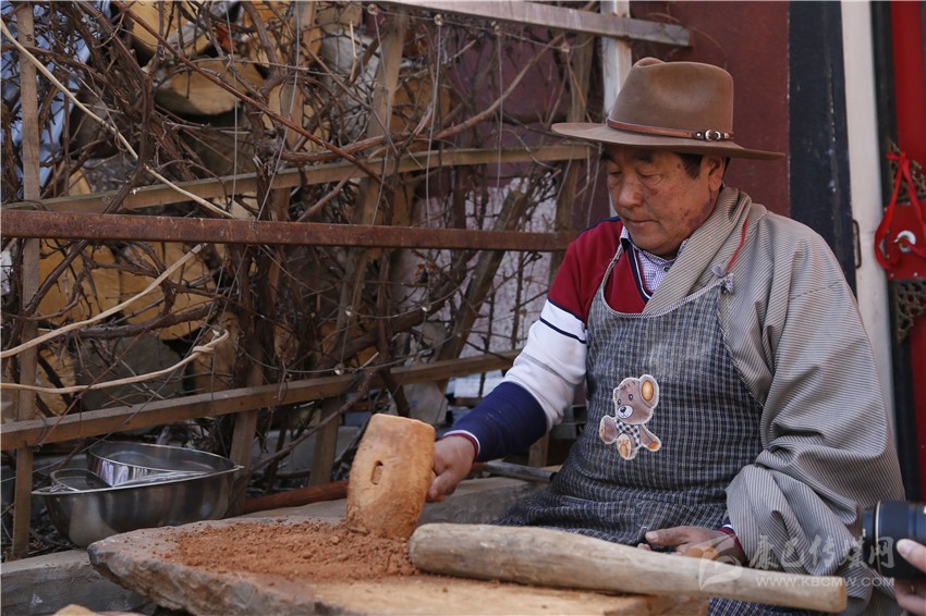 清晨,大師背起背簍和鋤頭來(lái)到海拔4000米以上的山上挖泥,挖泥前要舉行簡(jiǎn)單的祭祀儀式,用脫水的松柏枝和酥油糌粑混合燃燒。裊裊清香彌漫在山間,這時(shí)大師用鋤頭挖著制作藥泥面具的泥土,泥土分為紅色雌泥和白色雄泥,雌雄兩種泥土結(jié)合后具有一定的硬度,以此制作的面具不會(huì)出現(xiàn)裂開(kāi)的情況,同時(shí)保證配方藥不變質(zhì)。