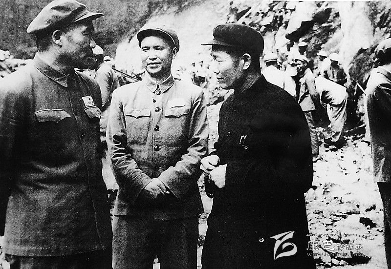 1953年秋,西南軍區(qū)副司令員李達(dá)代表賀龍司令員慰問川藏公路筑路部隊(duì)和職工,這是陳明義(中)陪同李達(dá)(左)在波密視察公路進(jìn)展情況。 (資料圖片)