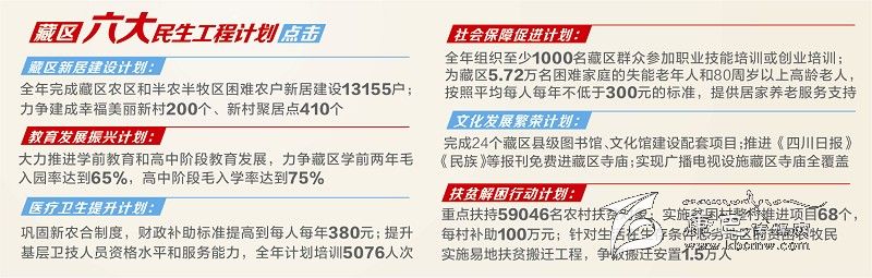 3月18日,四川省政府辦公廳印發(fā)《2015年藏區(qū)六大民生工程計(jì)劃總體工作方案》及藏區(qū)新居建設(shè)、教育發(fā)展振興、醫(yī)療衛(wèi)生提升、社會(huì)保障促進(jìn)、文化發(fā)展繁榮、扶貧解困行動(dòng)等六個(gè)實(shí)施方案,預(yù)計(jì)各項(xiàng)民生資金總投入約52.66億元(含群眾投工投勞)。今年藏區(qū)“六大民生工程計(jì)劃”亮點(diǎn)紛呈,其中包括取消建設(shè)性項(xiàng)目州縣配套資金。