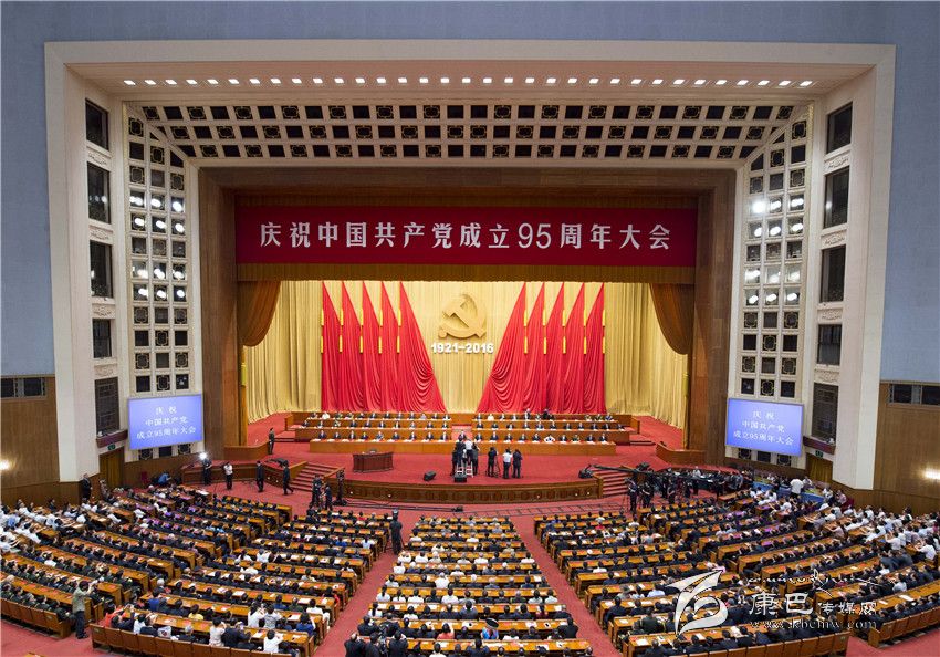 人民大會(huì)堂雄偉莊嚴(yán),萬(wàn)人大禮堂燈火輝煌。主席臺(tái)上方懸掛著“慶祝中國(guó)共產(chǎn)黨成立95周年大會(huì)”會(huì)標(biāo)。帷幕正中,由鐮刀和錘頭組成的中國(guó)共產(chǎn)黨黨徽在十面紅旗映襯下熠熠生輝,“1921-2016”字樣格外醒目。大禮堂二層眺臺(tái)懸掛橫幅:緊密團(tuán)結(jié)在以習(xí)近平同志為總書記的黨中央周圍,銳意進(jìn)取、開(kāi)拓創(chuàng)新,全面推進(jìn)黨的建設(shè)新的偉大工程,為實(shí)現(xiàn)“兩個(gè)一百年”奮斗目標(biāo)、實(shí)現(xiàn)中華民族偉大復(fù)興的中國(guó)夢(mèng)而努力奮斗!