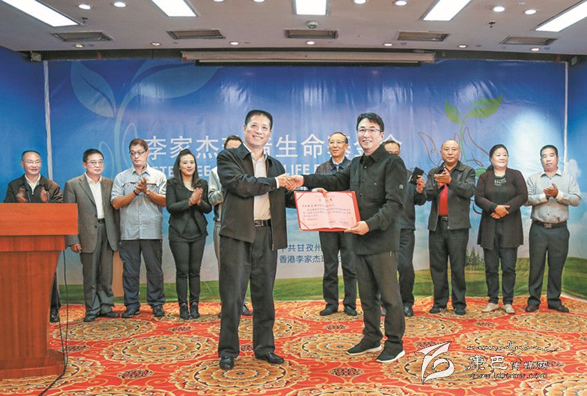 圖為劉成鳴向李家杰珍惜生命基金會頒發(fā)榮譽證書。