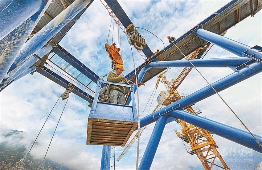 工人們在橋塔頂部調(diào)運(yùn)設(shè)備。
