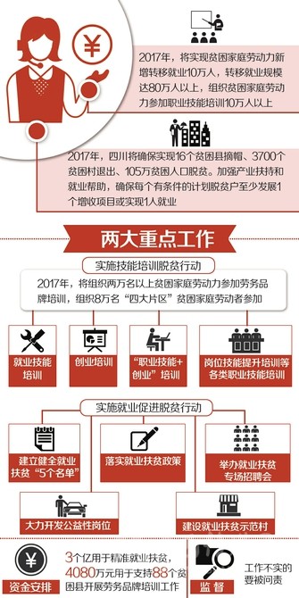 2017年,四川要“確保實(shí)現(xiàn)16個貧困縣摘帽、3700個貧困村退出、105萬貧困人口脫貧。加強(qiáng)產(chǎn)業(yè)扶持和就業(yè)幫助,確保每個有條件的計(jì)劃脫貧戶至少發(fā)展1個增收項(xiàng)目或?qū)崿F(xiàn)1人就業(yè)”的目標(biāo)。