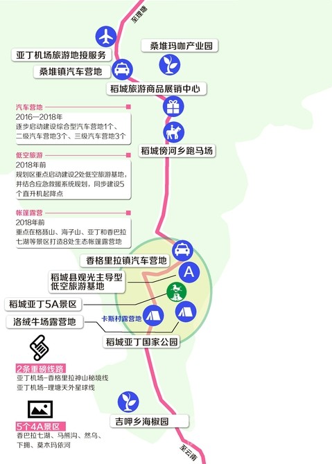 根據(jù)《規(guī)劃》,將結(jié)合道路交通和旅游景區(qū)景點(diǎn)分布,20162018年,逐步啟動(dòng)建設(shè)綜合型汽車營(yíng)地1個(gè)、二級(jí)汽車營(yíng)地3個(gè)、三級(jí)汽車營(yíng)地3個(gè),作為建設(shè)環(huán)亞丁兩小時(shí)旅游圈的重要旅游項(xiàng)目,滿足日益增長(zhǎng)的自駕車游客需求。