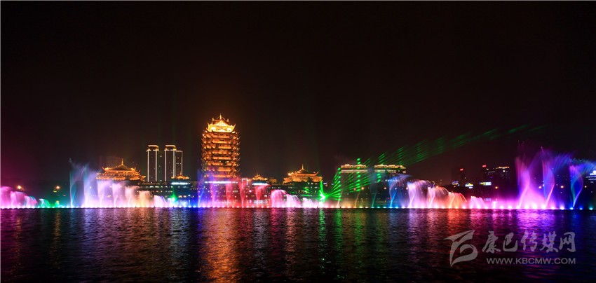 圖為眉山東坡市濕地公園音樂(lè)水舞噴泉。