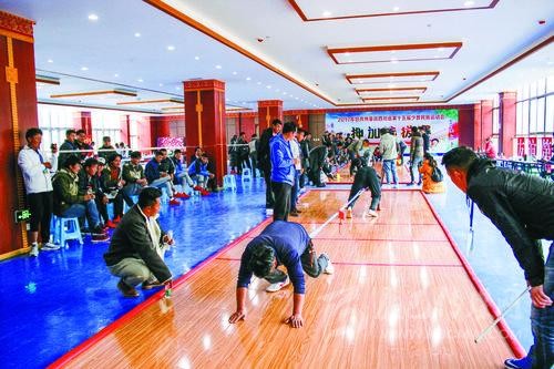 今年,我州將由115名運(yùn)動員、教練員等組成11支運(yùn)動隊(duì),參與賽事設(shè)置的8個競賽項(xiàng)目和2個表演項(xiàng)目,其中有兩支隊(duì)伍將參與綜合類表演項(xiàng)目比賽。我州總參賽人數(shù)相比上一屆略有減少。我州參加綜合類表演項(xiàng)目比賽的節(jié)目是《瑪亞切通》和《炯動》?!冬攣喦型ā纷g為孔雀吃水,主要體現(xiàn)力量和平衡的動作;《炯動》取材于藏民族農(nóng)村修建房屋時的勞動場面,以青年男女在勞動過程中載歌載舞對歌或比拼勞動成果、質(zhì)量、進(jìn)度為內(nèi)容,主要比拼身體的力量和靈活度。我州參加競技類表演項(xiàng)目比賽的節(jié)目是《嘎久》?!陡戮谩芬鉃榉嗰R鞍或吉祥翻越,是藏族人民節(jié)日聚會時的一種競技體育活動,主要比拼靈活性、趣味性和技巧性。