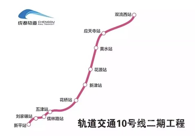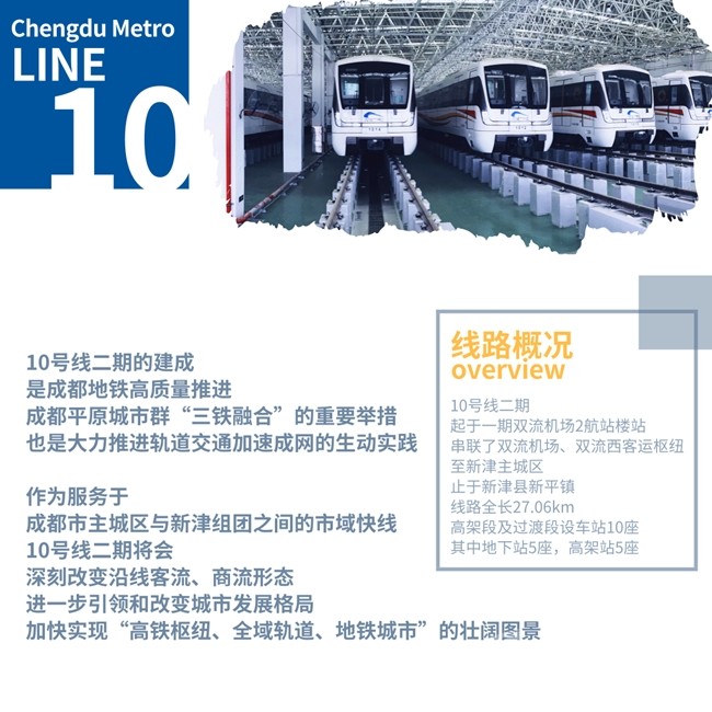 10號線二期起于一期雙流機場2航站樓站,串聯(lián)了雙流機場、雙流西客運樞紐至新津主城區(qū),止于新津縣新平鎮(zhèn),線路全長27.06km,高架段及過渡段設車站10座,其中地下站5座,高架站5座。