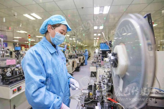 遂寧市經(jīng)開區(qū)藍(lán)彩電子智能信息化車間,工人正在生產(chǎn)線開足馬力加緊生產(chǎn)。