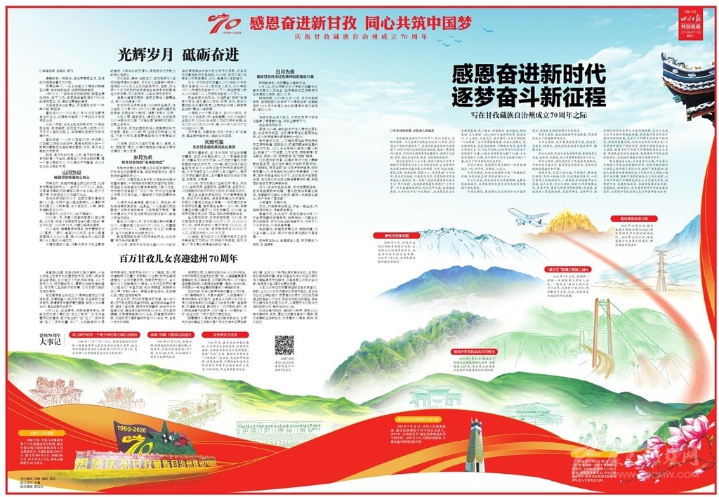 為慶祝甘孜建州70周年,《四川日?qǐng)?bào)》于9月15日推出八連版特別報(bào)道,整體以紅色打底,充滿喜慶的祝福。