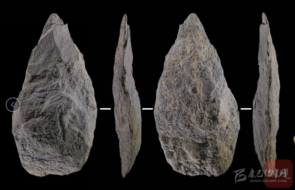 這件手斧,在東亞地區(qū)都可稱得上非常精美的一件。手斧加工比礫石石器更加復雜。古人通過對石塊兩側進行敲打,最后形成兩面對稱的手斧。手斧也是史前時代第一種兩面打制、加工精細的重型工具,在非洲發(fā)現(xiàn)的巨型手斧有的近30厘米長。早期的手斧打制較粗糙,到晚期,石器加工技術有了很大的進步。手斧器形較為規(guī)整,加工精湛。手斧的使用價值非常大,早期人類多用來挖掘根莖、加工木頭、刮獸皮,也用于宰殺大、小獵物和割剝獸皮,被稱作遠古人類的“瑞士軍刀”。
