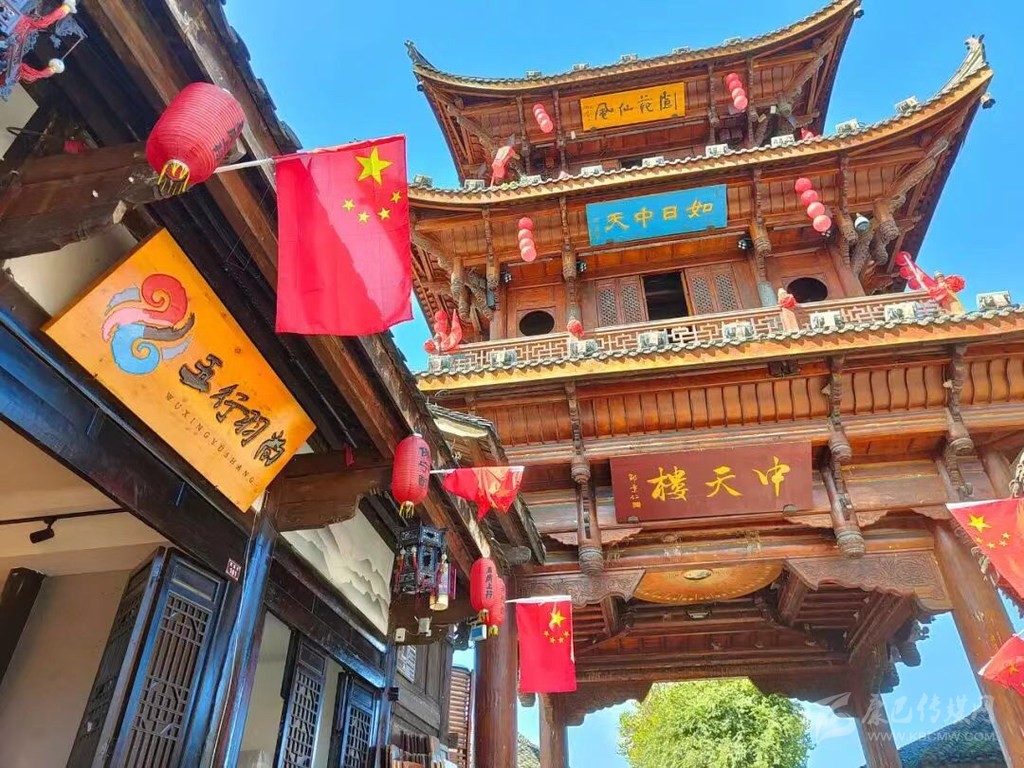 在南充古城閬中,以中天樓為核心鋪開的四條街道,全部被五星紅旗裝點開來,甚至部分街段上空鋪上了“紅旗?!薄P鲁堑闹鞲傻?,也掛上了一面面五星紅旗,站在街頭放眼望去,鮮艷的五星紅旗成為一道最靚麗的風景線。
