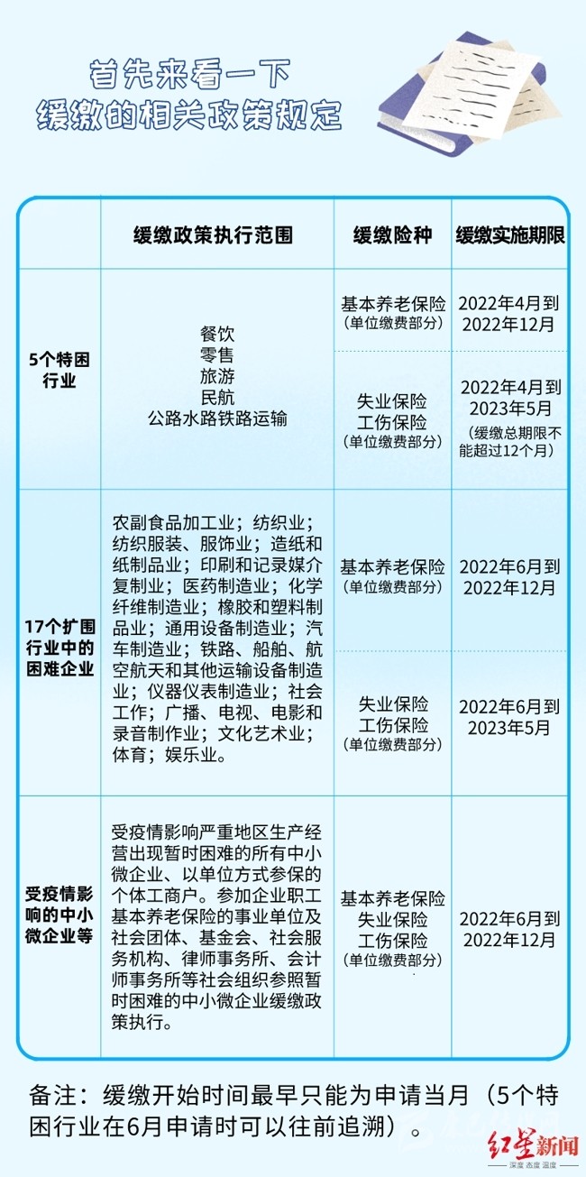在緩繳期限方面,對餐飲等5個特困行業(yè)緩繳養(yǎng)老保險費期限延長至2022年12月31日。對17個緩繳擴圍行業(yè)所屬困難企業(yè),養(yǎng)老保險費緩繳實施期限至2022年12月31日,工傷、失業(yè)保險費緩繳期限不超過1年。緩繳期間免收滯納金。