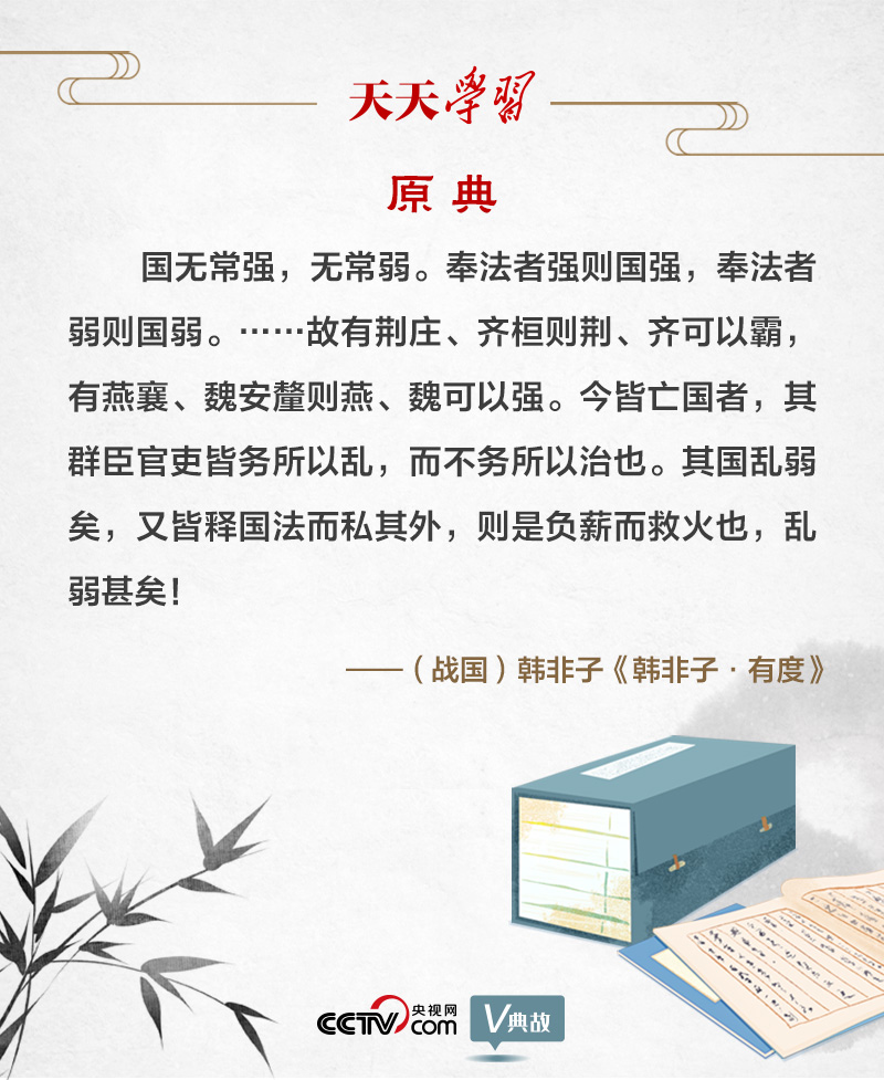 韓非子是戰(zhàn)國(guó)時(shí)期法家思想的集大成者。“有度”,就是有法度。韓非子把“奉法”作為治亂興亡的關(guān)鍵,提出“國(guó)無(wú)常強(qiáng),無(wú)常弱。奉法者強(qiáng)則國(guó)強(qiáng),奉法者弱則國(guó)弱”。意思是,國(guó)家不會(huì)永遠(yuǎn)富強(qiáng),亦不會(huì)長(zhǎng)久貧弱。執(zhí)行法度的人堅(jiān)決,國(guó)家就會(huì)富強(qiáng);執(zhí)行法度的人軟弱,國(guó)家就會(huì)貧弱。