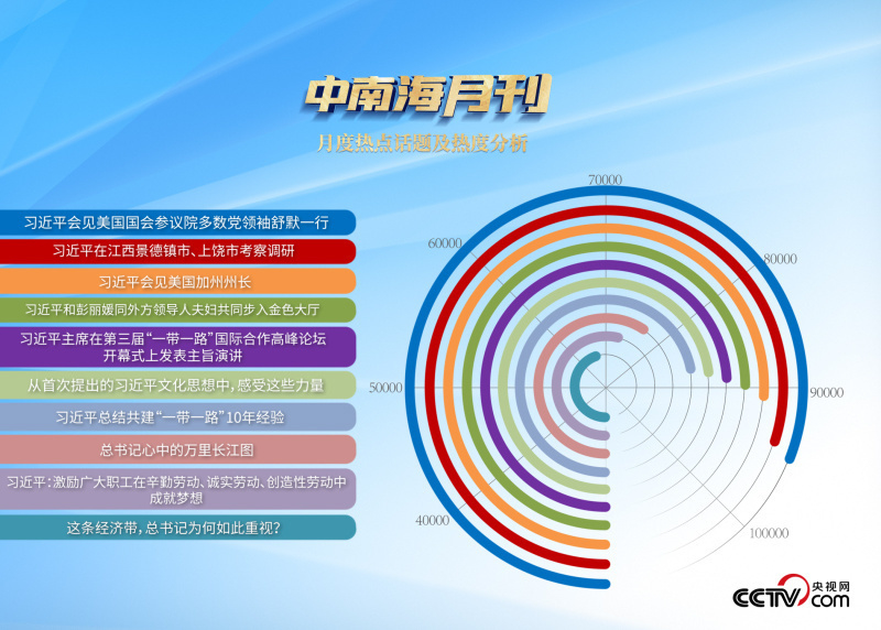 央視網(wǎng)“智聞”系統(tǒng)提取分析10月全網(wǎng)時(shí)政新聞熱點(diǎn)顯示,“習(xí)近平主席會(huì)見(jiàn)美國(guó)國(guó)會(huì)參議院多數(shù)黨領(lǐng)袖舒默一行”“習(xí)近平會(huì)見(jiàn)美國(guó)加州州長(zhǎng)”“習(xí)近平主持召開(kāi)進(jìn)一步推動(dòng)長(zhǎng)江經(jīng)濟(jì)帶高質(zhì)量發(fā)展座談會(huì)”等話題最受網(wǎng)民關(guān)注。