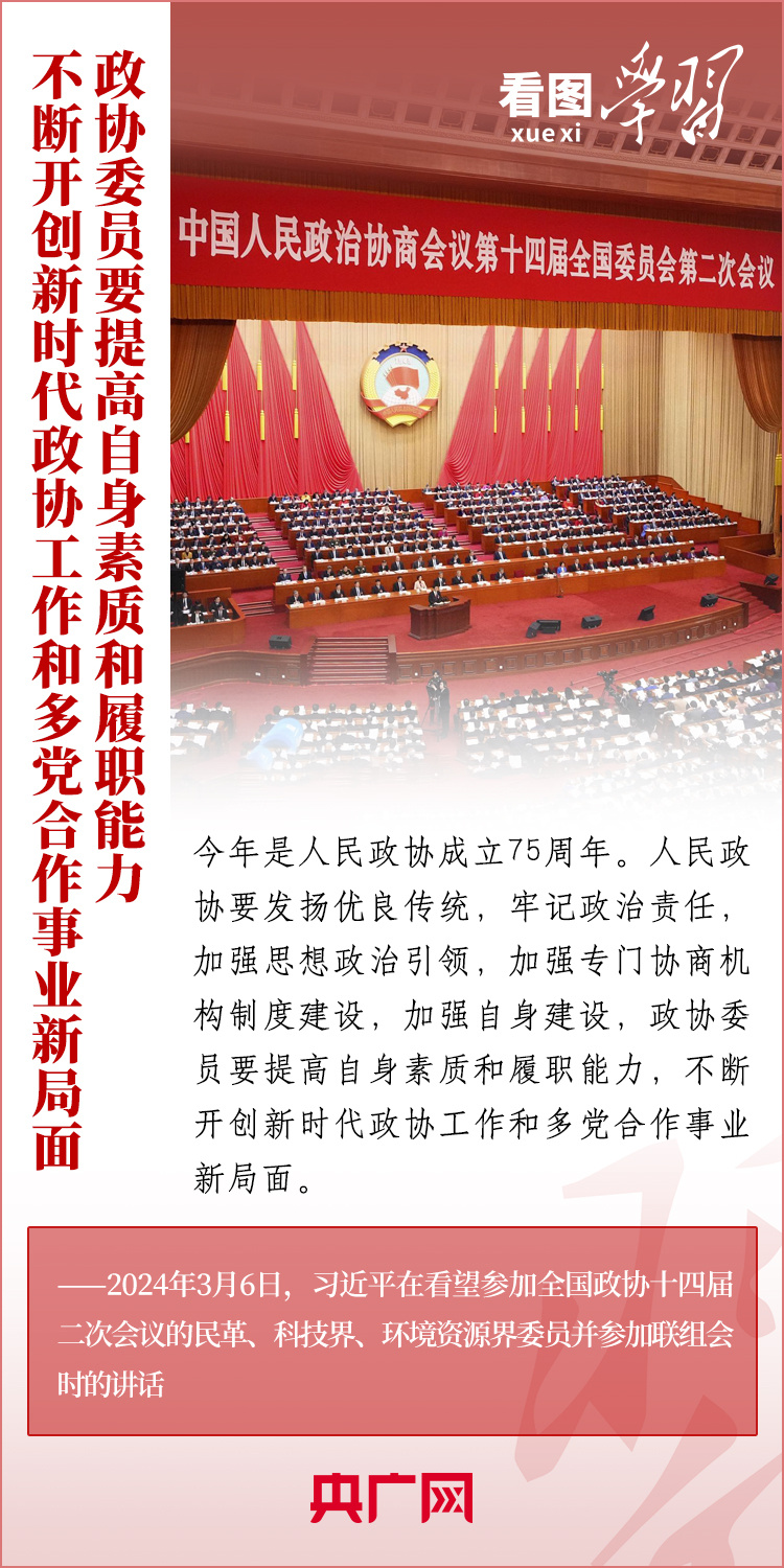 今年是人民政協(xié)成立75周年。3月6日下午,習(xí)近平總書記在看望參加全國政協(xié)十四屆二次會議的民革、科技界、環(huán)境資源界委員并參加聯(lián)組會時強調(diào),人民政協(xié)各黨派、各團體、各族各界各方面人士要圍繞中共二十大提出的重大戰(zhàn)略任務(wù)和中央經(jīng)濟工作會議部署,深入調(diào)查研究,積極建言資政,廣泛凝聚共識,助力中國式現(xiàn)代化建設(shè)。一起來學(xué)習(xí)!