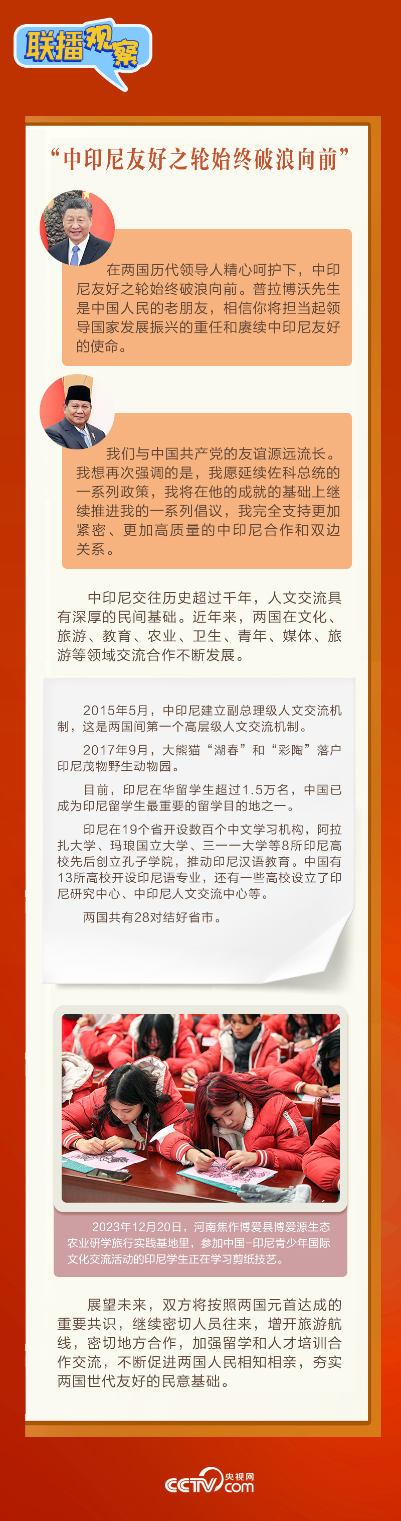 會談中,習主席以“船”為喻,稱贊“中印尼友好之輪始終破浪向前”,強調“愿同印尼深化全方位戰(zhàn)略合作,構建具有地區(qū)和全球影響力的中印尼命運共同體”。普拉博沃當選總統(tǒng)表示“中國是印尼強有力的合作伙伴”,并指出“完全支持發(fā)展更加緊密的印尼同中國關系”。